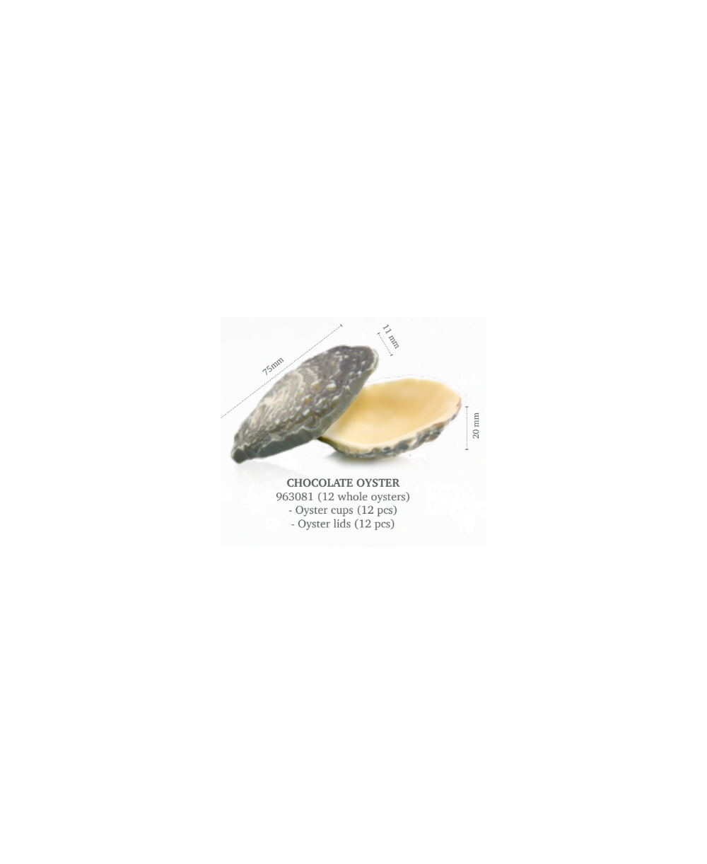 Ostrica di cioccolato adatta per un ristorante di pesce che vuole concludere mantenendo lo stesso tema. Da farcire con crema di mascarpone o a piacimento. Effetto visivo importante.